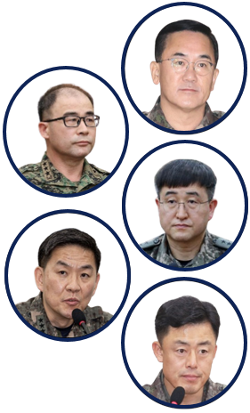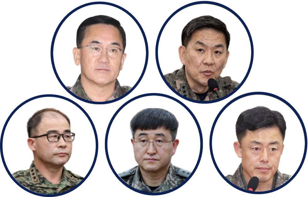 박안수 (육군참모총장), 곽종근 (육군특전사령관), 이진우(육군수도방위사령관), 여인형(국군방첩사령관), 문상호(국군정보사령관)