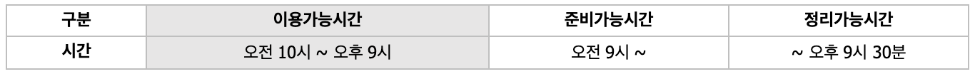 ※ 안내: 대관 가능 최소 시간은 2시간입니다. “대관가능시간”은 [준비가능시간]부터 [정리가능시간]까지 입니다. 이용시간은 본행사시간을 의미합니다(이외 시간에 행사 진행자 외 인원의 출입은 불가합니다).