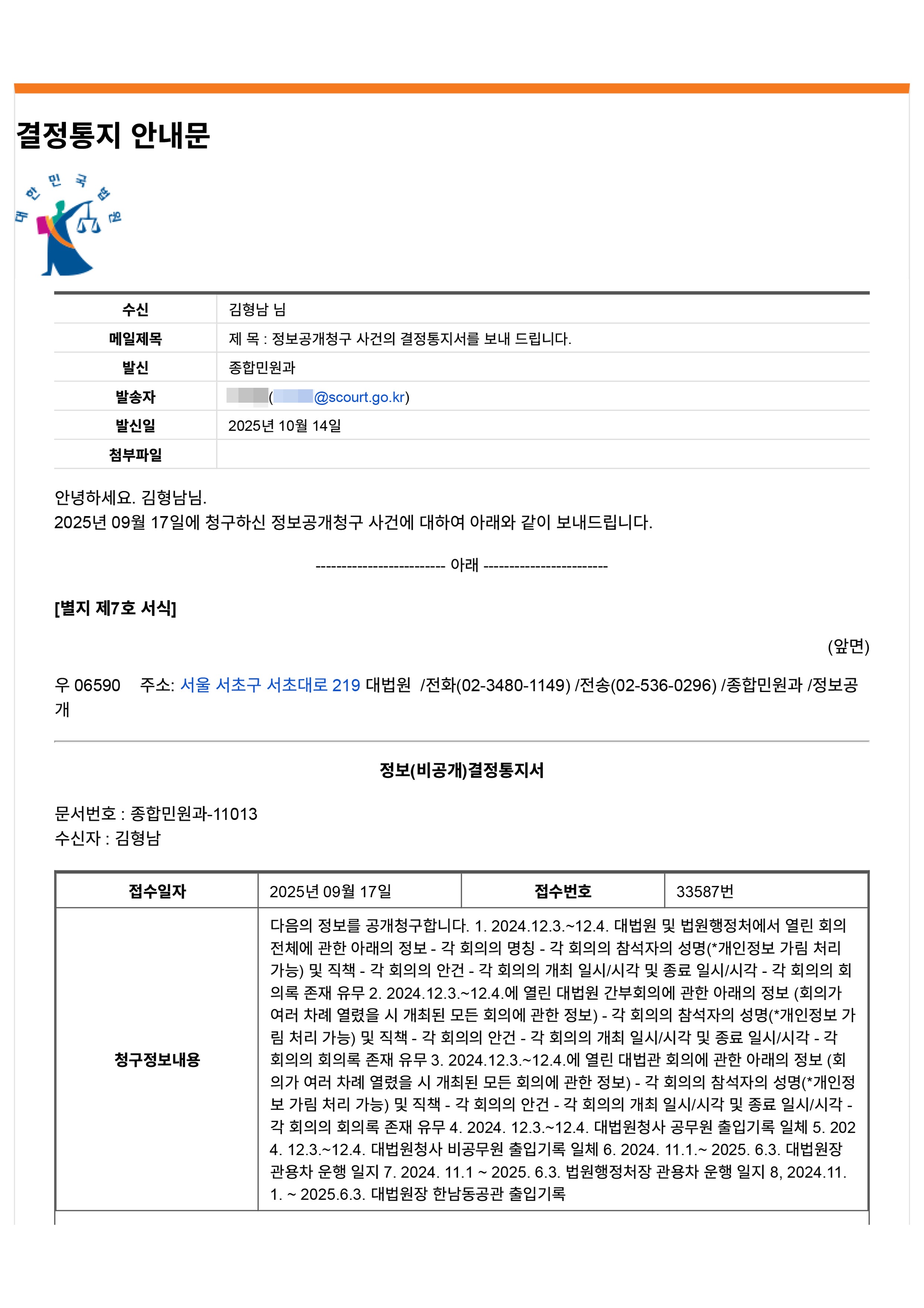 - 대법원, 대법원장 공관 출입기록 등 내란 부역 관련 정보공개청구, 전부 비공개/부존재 처분 -